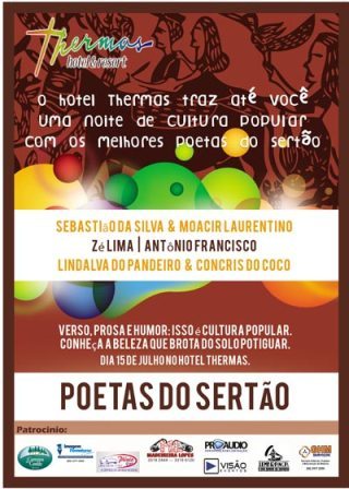 Em função da excelente taxa de ocupação de julho, o Hotel Thermas está reforçando sua programação cultural. Os eventos que já acontecem normalmente no parque aquático, de segunda a sexta, durante todo ano, ganharam um novo foco: o cultural. Um dos pontos altos dessa programação especial de férias acontece nesta sexta-feira (15), com a realização do show “Poetas do Sertão”, celebrando a cultura popular do nordeste, em especial, a do Rio Grande do Norte. O evento contará com a participação dos poetas e emboladores Sebastião da Silva, Moacir Laurentino, Zé Lima, Antônio Francisco, Lindalva do Pandeiro e Concris do Coco e ocorrerá, a partir das 20h, no Parque Aquático do Thermas.