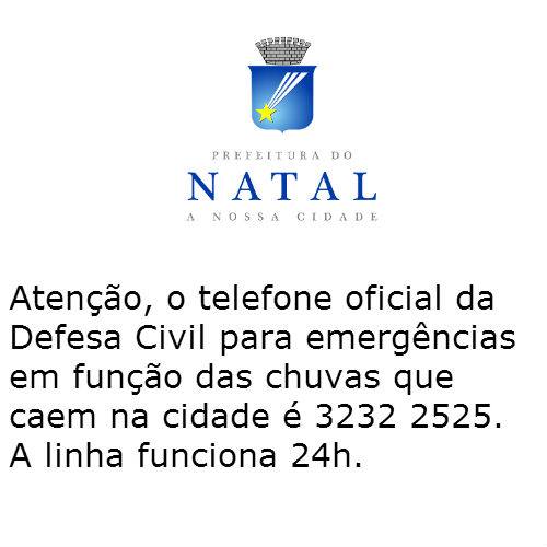 Com gabinete de emergência montado desde a noite de ontem por causa das fortes chuvas, a Prefeitura de Natal informa que o telefone oficial da Defesa Civil para emergência é o: 3232 2525.