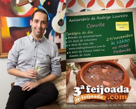 Para comemorar sua mudança de idade, o blogueiro Rodrigo Loureiro promoverá neste sábado,29/11 mais uma edição da sua “ Feijoada.com”. Na ocasião o jornalista também irá comemorar os 11 anos de colunismo e aniversário do seu site. O evento acontecerá no hotel Pirâmide, tendo como acesso pulseiras, que estão à venda na banca Cidade do Sol, do amigo Tota. A animação está garantida com a banda Trio Metal, agintando com o melhor do forró, sertanejo e axé.