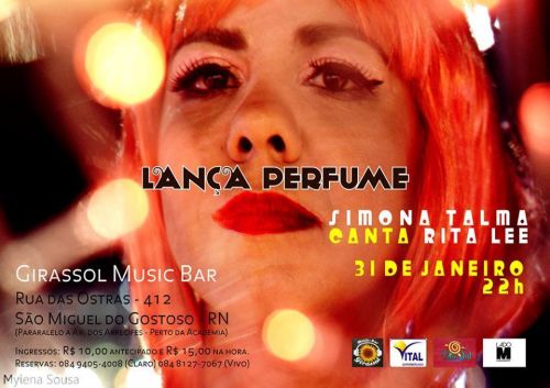 Neste final de semana, é a vez da cantora Simona Talma se apresentar na Praia de São Miguel do Gostoso, no Girassol Music Bar. Apesar de ter uma carreira consolidada e com sucessos próprios, a cantora irá interpretar diversas canções da cantora Rita Lee, em um show intitulado de Lança Perfume. Os ingressos estão sendo vendidos no local.