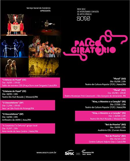 Considerado o maior projeto do país em termos de difusão das artes cênicas, a 18ª edição do Palco Giratório traz ao Rio Grande do Norte o segundo espetáculo: Criaturas de Papel, da Cia Bricoleiros (CE). O projeto do Sesc, apresentou a peça em Caicó no último sábado (16), no Centro Cultural Adjuto Dias, e em Mossoró será nesta segunda-feira (18), às 20h, no Teatro Dix-huit Rosado. Para assistir, basta doar 2 kg de alimentos. A iniciativa é do Sistema Fecomércio, realizada por meio do Serviço Social do Comércio (Sesc RN).