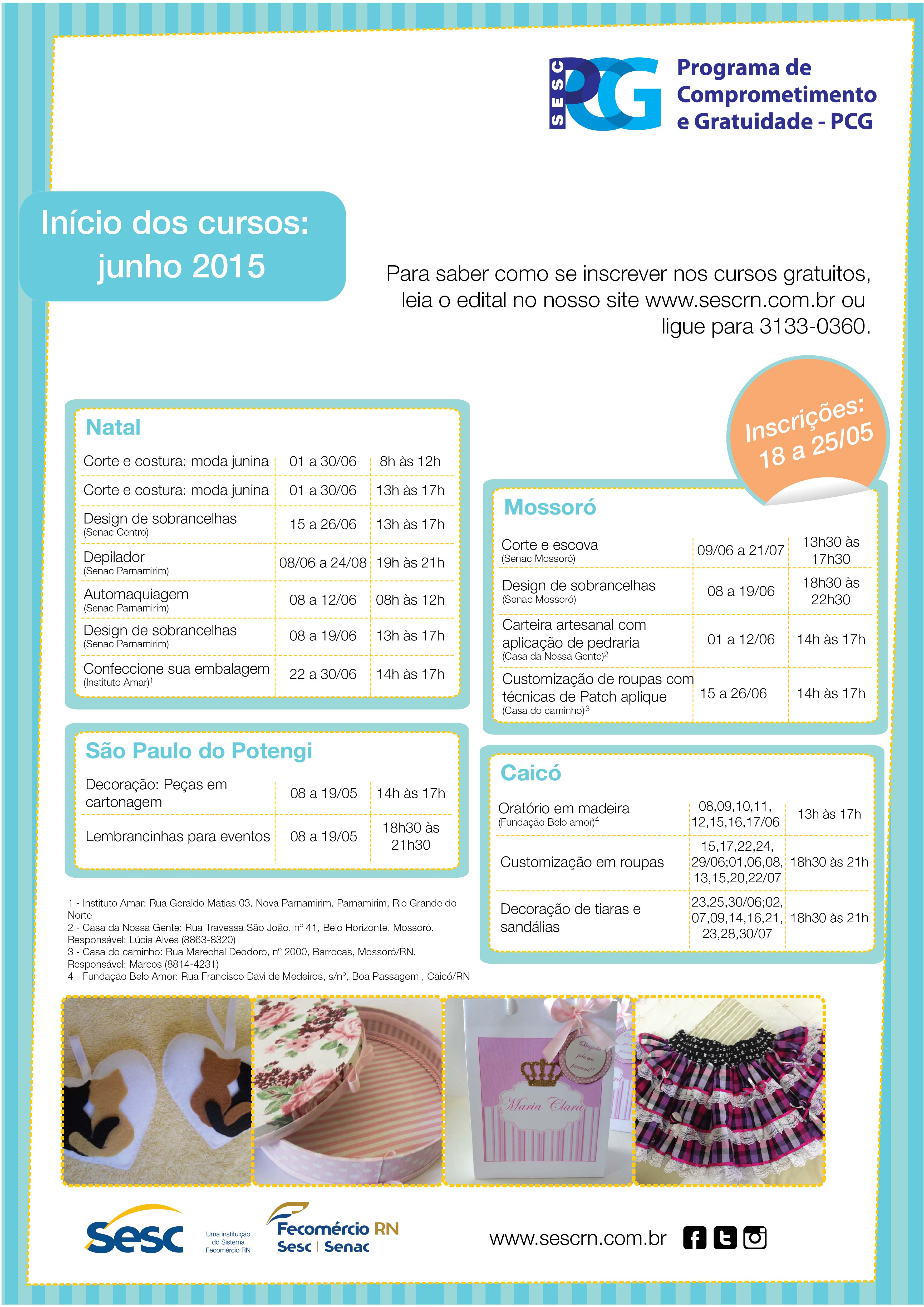 Aproveitado a proximidade das festas de São João, o curso de corte e costura será voltado à moda junina. Ainda na área de trabalhos manuais, serão disponibilizados cursos como decoração com cartonagem, construção de oratório de madeira e lembrancinhas para eventos. Em parceria com o Senac RN, serão oferecidos cursos de beleza, entre eles o de automaquiagem e de depilação. “O PCG é um programa que promove a inclusão social a partir da oferta de cursos gratuitos em trabalhos manuais, educação e, este ano, beleza. Ao realizá-lo mensalmente, cumprimos nosso papel social, priorizando o comerciário potiguar”, diz a diretora do Sesc RN, Jeane Amaral. Ao todo, 13 tipos de curso são ofertados de forma gratuita.