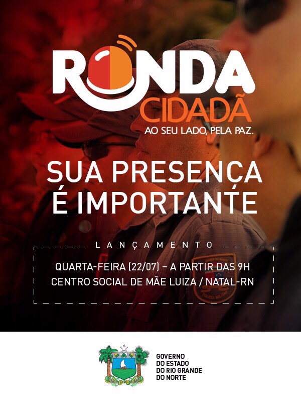 O Governo do Estado, por meio da Secretaria da Segurança Pública e da Defesa Social, lançará o Programa Ronda Cidadã na próxima quarta-feira (22) às 9h, no Centro Social Padre João Perestrelo, em Mãe Luiza, Zona Leste de Natal.
