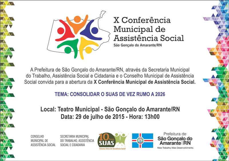 A Prefeitura Municipal de São Gonçalo do Amarante vai realizar a X Conferência Municipal de Assistência Social. O evento é promovido pela Secretaria de Trabalho, Assistência Social e Cidadania e o Conselho Municipal de Assistência Social.