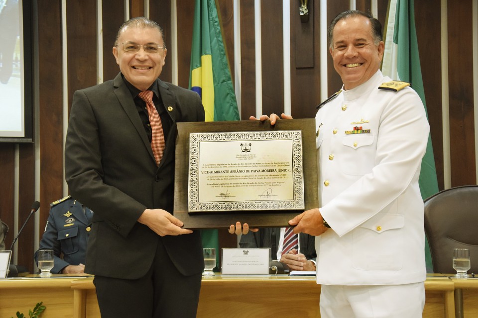 A Assembleia Legislativa do Rio Grande do Norte, por propositura do deputado Albert Dickson (PROS), entregou na manhã desta sexta-feira (28) ao vice-almirante da Marinha do Brasil, Afrânio de Paiva Moreira Júnior, o título de cidadão norte-riograndense. O militar nasceu no Rio de janeiro e atualmente comanda o 3º Distrito Naval no Rio Grande do Norte.