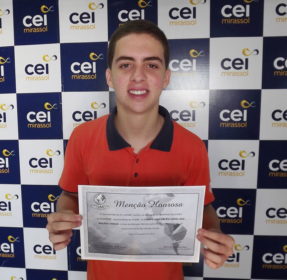 O certificado de Menção Honrosa recebido pelo aluno foi resultado do seu excelente desempenho no Comitê Assembleia Geral das Nações Unidas, representando a China. Neste ano, Guilherme Bulhões também foi eleito presidente do Grêmio Estudantil Ayrton Senna da Silva, do colégio CEI Mirassol.