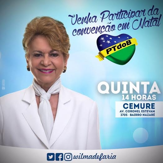 Nas redes sociais, a deputada estadual e a vice-prefeita de Natal convidam sua militância para a festa partidária. Vejam mensagem de Wilma: “Tenho um convite pra vocês, amigos de toda Natal. A nossa convenção do PTdoB vai ser amanhã à tarde. Vai ser uma convenção conjunta com o PSDB e com os outros partidos com quem vamos nos coligar em uma grande frente a favor de Natal. Vamos definir nossos candidatos a prefeito, vice-prefeito e vereadores. E vamos apresentar nosso projeto para fazer Natal superar seus problemas e avançar. Você é nosso convidado. Venha participar! Muito obrigada e até lá”.