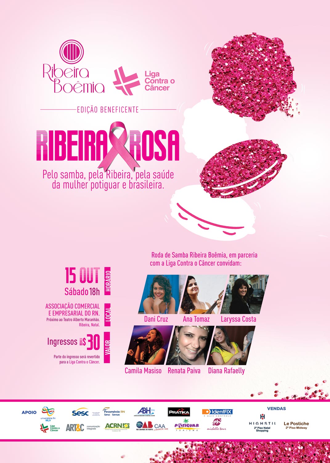 O Ribeira Rosa será realizado em parceria com a Liga Contra o Câncer e contará com os importantes apoios culturais da Associação Comercial e Empresarial do RN; Universitária FM; Sesc – Sistema Fecomércio RN; PRATIKA Locações; ABIH RN; CAA – OAB RN; Le Postiche; HIGHSTIL; Empório da Limpeza; Imunizadora Potiguar; e AR Geradores.