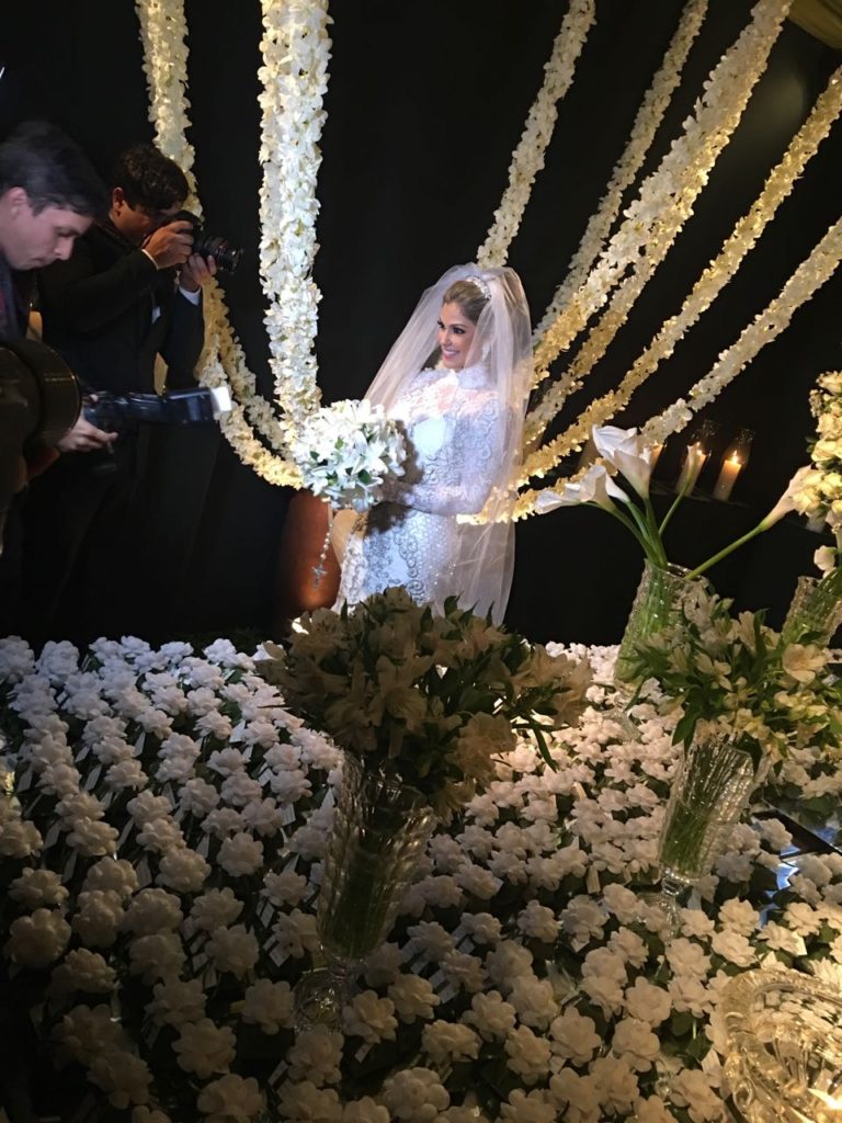 A decoração estava deslumbrante com rosas brancas e lustres de cristal. Cada detalhe foi pensado para oferecer o melhor aos convidados.
