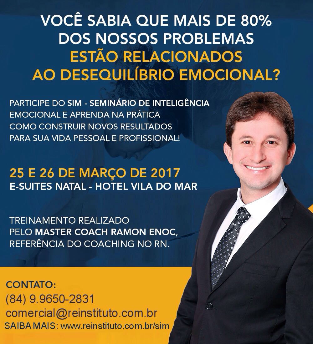 Nestes dias de mudanças econômicas, políticas, tecnológicas e sociais, que afetam desde o pessoal até o lado profissional da vida de todas as pessoas, é preciso estar atento para não perder o rumo e ficar fora de boas oportunidades. É por isso que o Ramon Enoc Instituto (REI) realizará nos próximos dias 25 e 26 de março de 2017, a segunda edição do SIM – Seminário de Inteligência eMocional, que ocorrerá no Hotel Vila do Mar, na Via Costeira de Natal.
