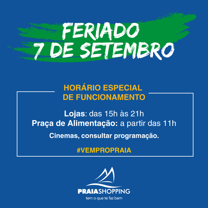 O Praia Shopping divulga o horário especial de funcionamento para feriado do Dia da Independência do Brasil. Na próxima quinta, 7 de setembro, a praça de alimentação abre a partir das 11 horas e as demais lojas funcionam, das 15 às 21 horas. Para saber sobre o funcionamento do cinema, basta acessar o site do Praia: www.praiashopping.com.br