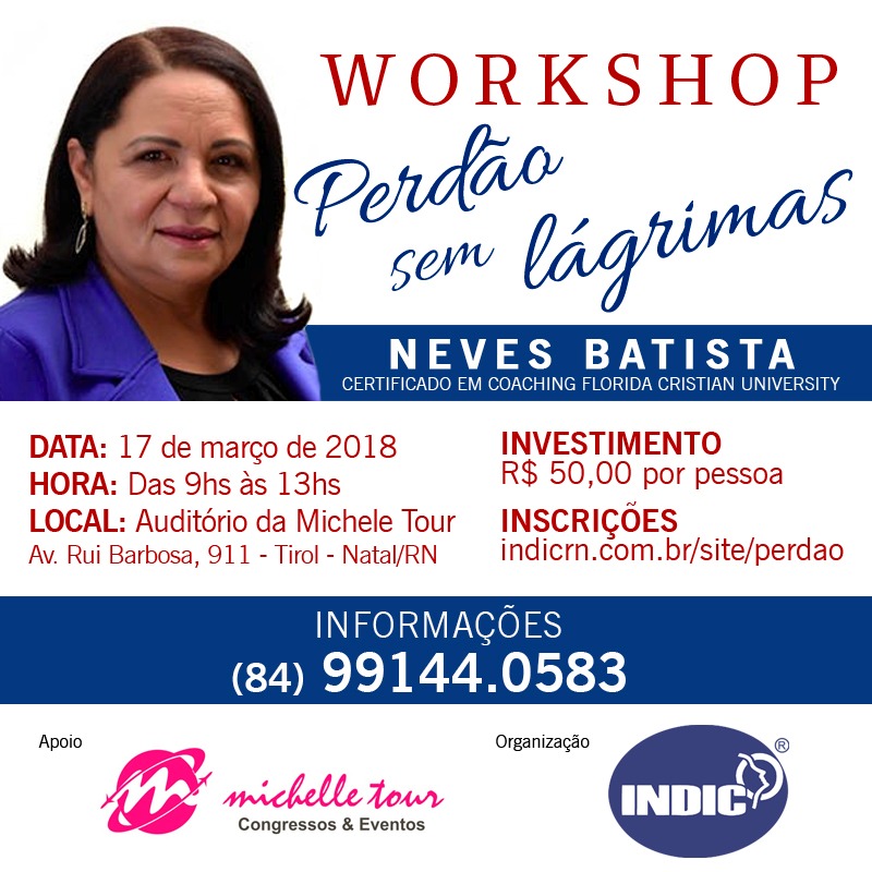 O perdão sem lágrimas é uma forma inteligente para quem necessita se libertar dos padrões hereditários que tanto fazem sofrer e que foram incutidos na infância devido às crenças limitantes dos seus pais e/ou professores. São estas e outras questões que serão discutidas durante o workshop Perdão sem lágrimas, que acontecerá no dia 17 de março de 2018 (sábado), das 9h às 13h, no auditório da Michele Tour, no Tirol e será ministrado pela psicanalista Neves Batista.