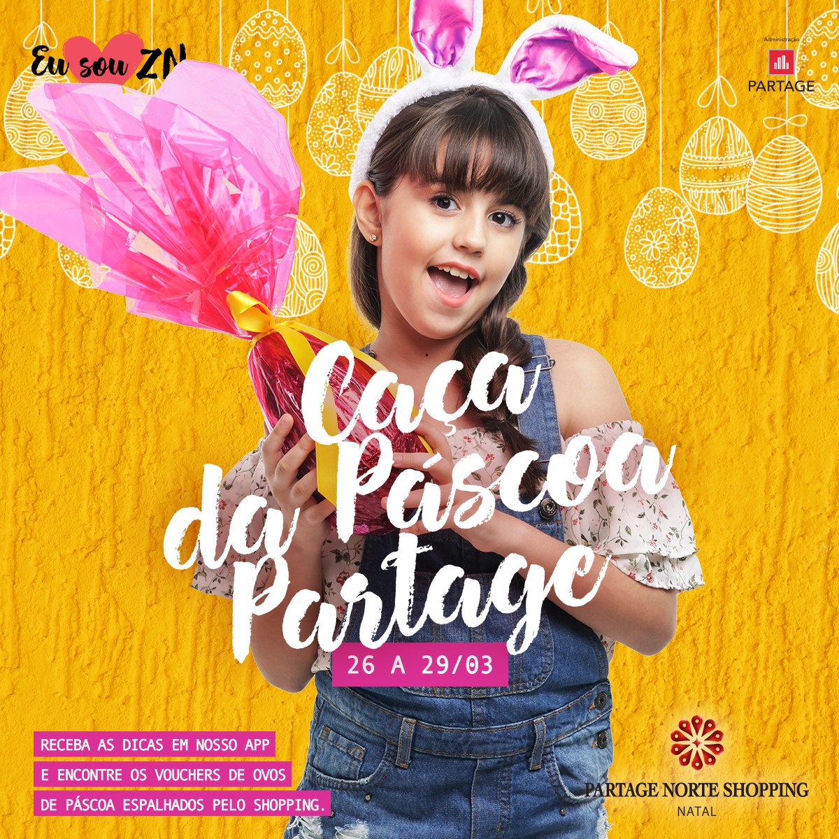 De 26 a 29 de março, o empreendimento vai promover uma “Caça aos Ovos” pelo mall. Vários vouchers premiados serão distribuídos pelos dois pisos e as dicas para encontrá-los serão dadas através de notificações, enviadas aos portadores do aplicativo do shopping, que está disponível na App Store e Google Play (Partage Natal), a partir das 14h, sendo dois ganhadores por dia.