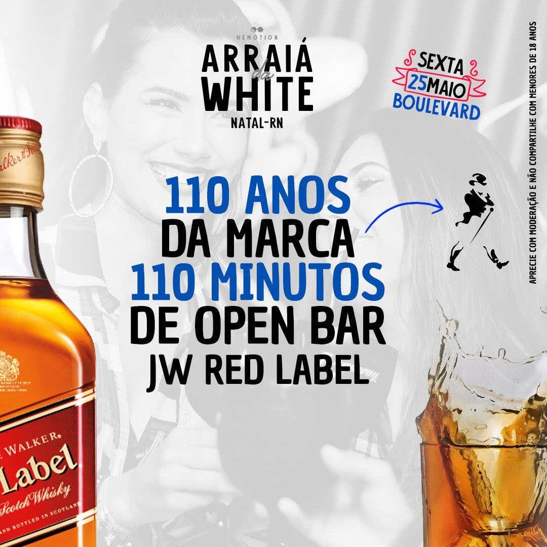 O que era bom ficou melhor. O Arraiá da White que acontece dia 25 de maio no Boulevard Recepções, além das atrações que seraõ: Mano Walter, Walkyria Santos, Henry Freitas, Thiago TTX, os djs Guga Holanda e Ralk.  Terão 110 minutos de Open Bar de JW Red Label. Tudo isso para celebrar os 110 anos do Striding Man (o lendário símbolo da marca).