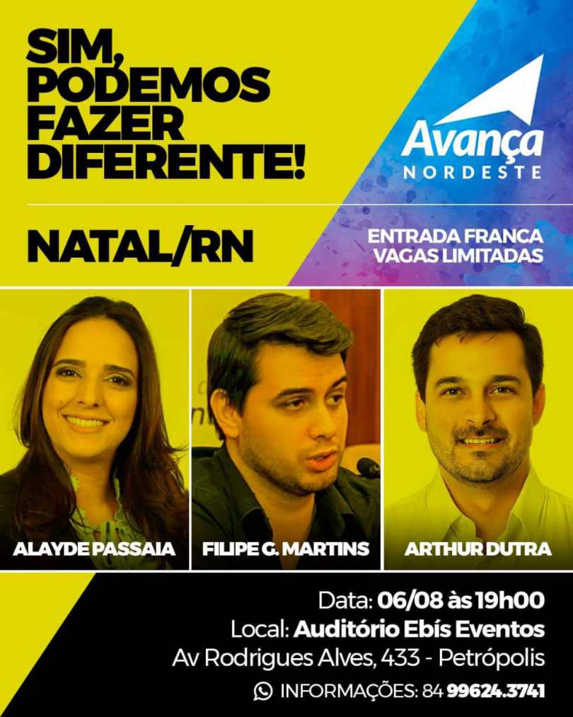 O EVENTO TERÁ COMO PALESTRANTES O PRÉ-CANDIDATO A DEPUTADO FEDERAL PELO SOLIDARIEDADE, O POTIGUAR ARTHUR DUTRA E TAMBÉM, ALAYDE PASSAIA (RN) E FILIPE G. MARTINS (DF).Desenvolvido para fomentar o ambiente cultural, político e filosófico em torno de temas sociais e econômicos, a primeira etapa do Circuito de Palestras “Avança Nordeste 2018” será realizada, em Natal/RN, às 19h desta segunda-feira (6), no auditório Ebís Eventos. Com o tema “Sim, podemos fazer diferente!”, o evento terá como palestrantes o pré-candidato a deputado federal pelo Solidariedade, o potiguar Arthur Dutra e também, Alayde Passaia (RN) e Filipe G. Martins (DF).