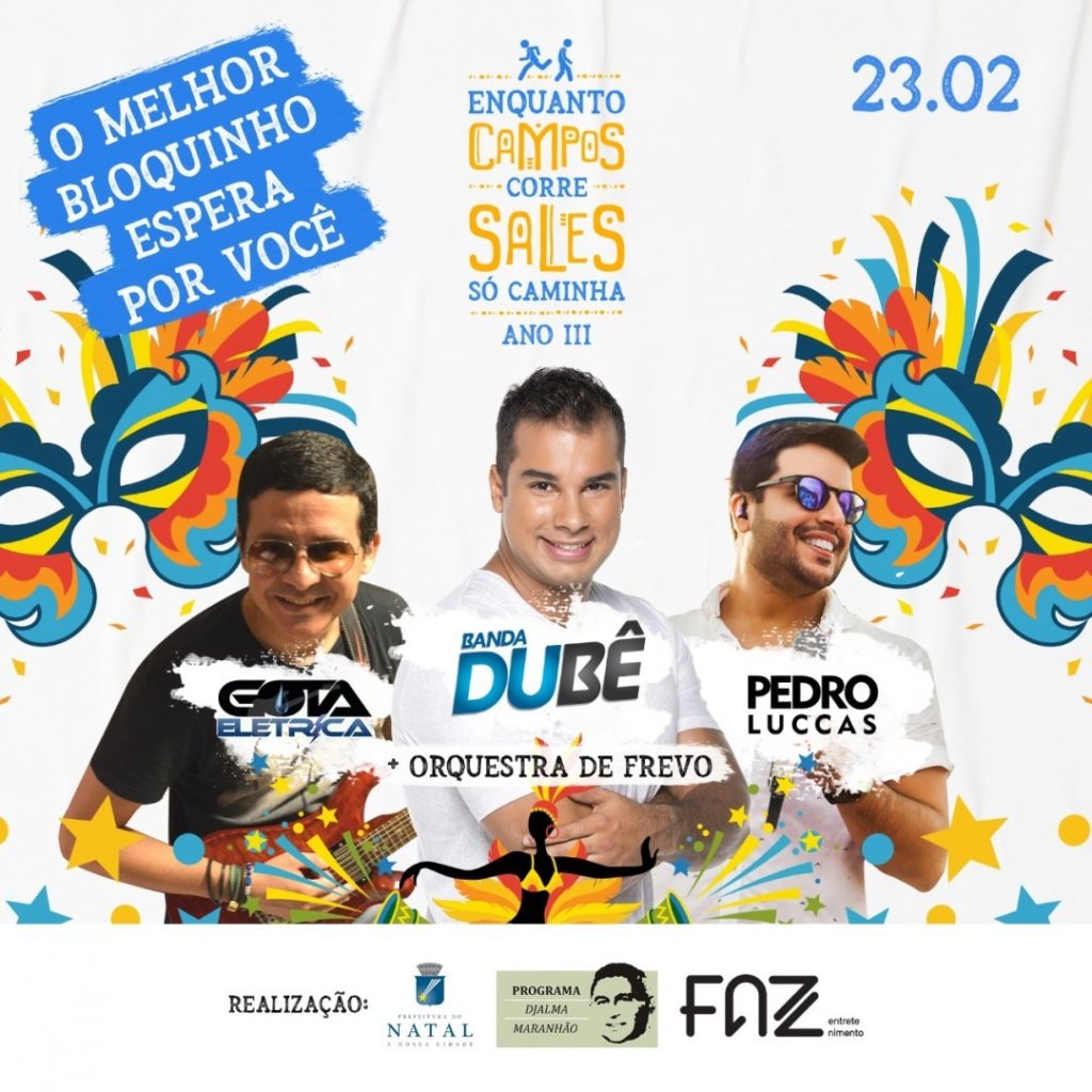 Um dos bloquinhos mais tradicionais do carnaval de Natal, o “Enquanto Campos Corre, Sales Só Caminha” está de cara nova, mas promete a mesma alegria de sempre com data marcada para animar as ruas: 23 de fevereiro, o sábado anterior à folia de momo.