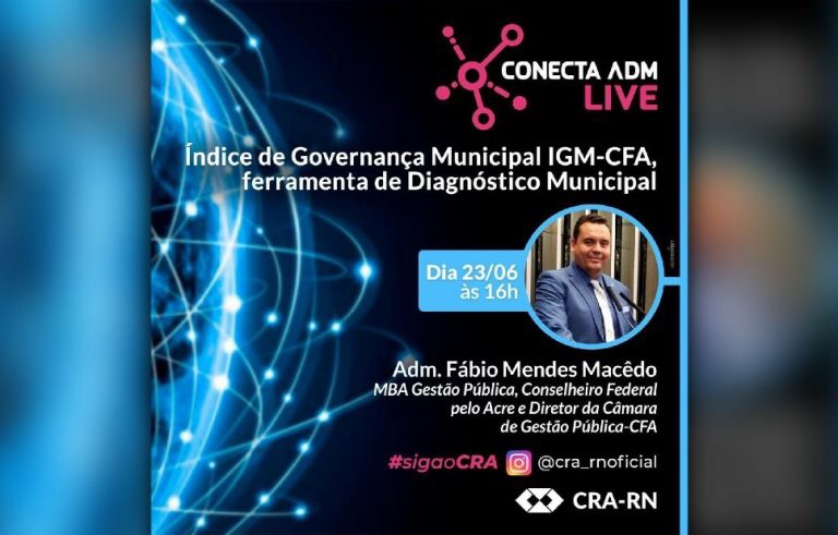 O Conselho Regional de Administração do N realiza mais um Conecta ADM, que discute Índice de Governança Municipal – IGM. Na próxima terça-feira (23/06), o Projeto Conecta ADM, vai contar com a participação do MBA em Gestão Pública e Diretor da Câmara de Gestão Pública do CFA, Fábio Mendes Macêdo.