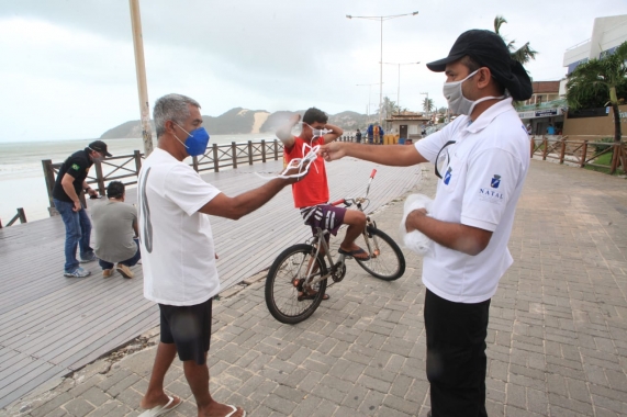 Nas praias do Meio, Forte, Redinha e Ponta Negra, frequentadores foram orientados sobre a necessidade de uso do equipamento de proteção individual e os donos dos estabelecimentos comerciais receberam máscaras para distribuir com seus funcionários.