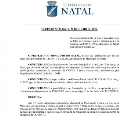 A Prefeitura do Natal publicou nesta terça-feira (21/07), em Edição Extra do Diário Oficial do Município, medidas que visam conter aglomerações nas praias e espaços públicos da cidade. Caso seja necessário, ruas e avenidas que dão acessos a esses locais serão fechadas para evitar a disseminação do novo coronavírus. A edição traz também o Protocolo Geral da Retomada Gradual e Responsável de Reabertura de Setores Econômicos na capital, medidas consideradas essenciais para o combate à pandemia da Covid-19.