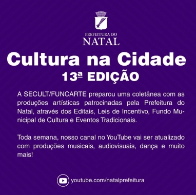 Artes Plásticas, Exposições, Cultura Popular, Samba e Poesia. A décima terceira edição do “Cultura na Cidade” traz opções de lazer em casa para todos os gostos e estilos. A cada semana, os potiguares podem conferir a produção de projetos patrocinados pela Prefeitura do Natal nos últimos anos através de Editais, Leis de Incentivo, Fundo Municipal de Cultura e conhecer o acervo permanente do Município. Lazer de qualidade no Youtube para o isolamento social dos natalenses no endereço https://www.youtube.com/natalprefeitura.