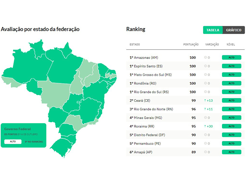 Após seguidos aumentos de pontuação na avaliação de transparência de informações relacionadas à Covid-19 divulgada pela ONG Open Knowledge Brasil, o Rio Grande do Norte assumiu a terceira colocação no ranking, entre todos os Estados da Federação. No Nordeste, ficou em 2º lugar e 6 pontos acima do Governo Federal, que se posiciona como a 8ª maior nota de transparência Covid quando classificado junto aos Estados e ao Distrito Federal.