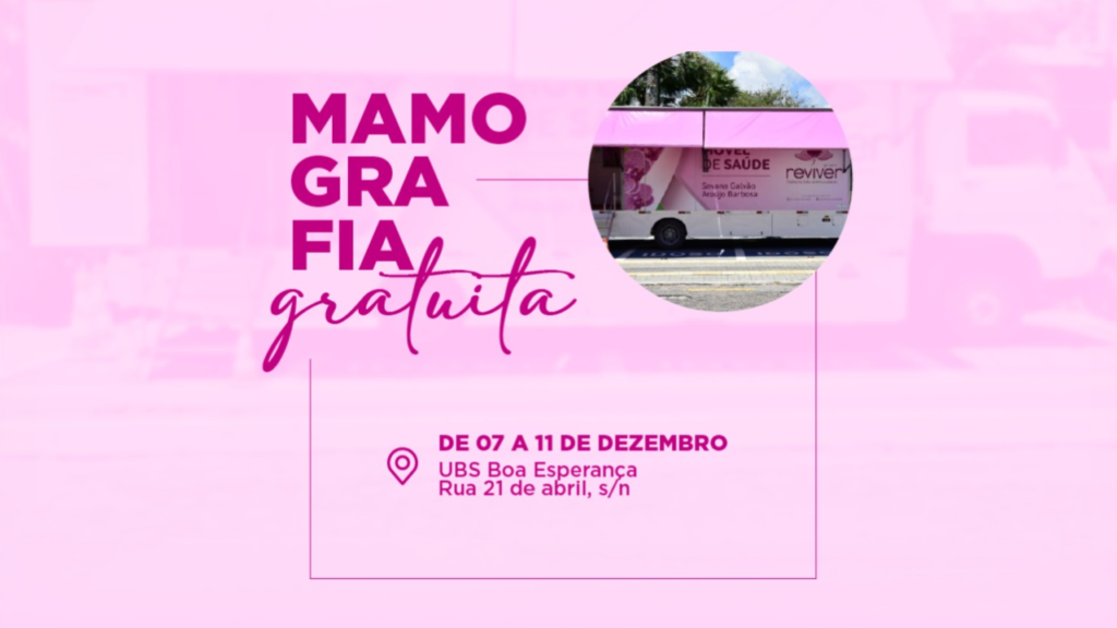 A Unidade Móvel Reviver, que realiza mamografias para mulheres entre 40 e 69 anos, estará na Unidade Básica de Saúde (UBS) de Boa Esperança a partir de segunda-feira (7 a 11 de dezembro). O atendimento ocorre das 7h30 às 16h30 e para ter acesso é preciso apresentar carteira de identidade, cartão SUS Parnamirim, comprovante de residência de Parnamirim e encaminhamento médico.