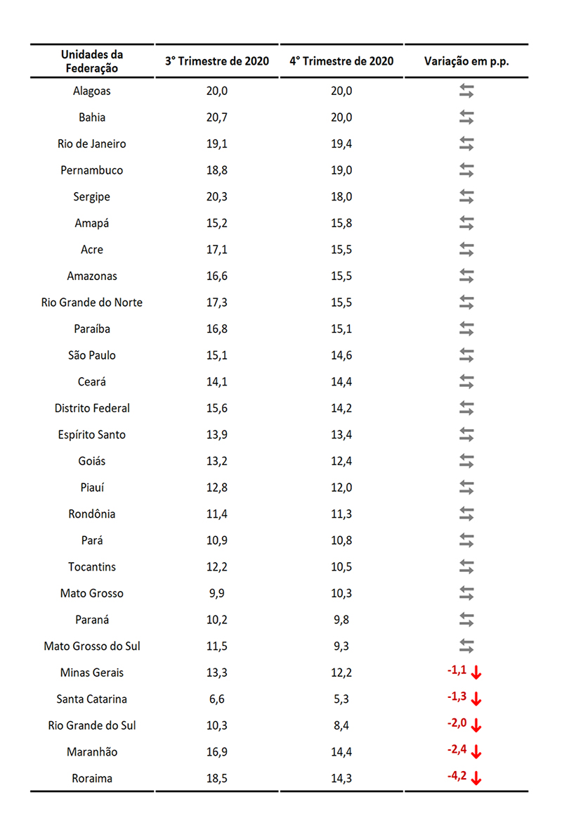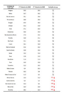 Já frente ao mesmo trimestre de 2019, 19 unidades da Federação tiveram aumento na taxa e as demais mantiveram estabilidade no indicador. Os maiores aumentos foram observados em Alagoas (6,4 p. p.), Rio de Janeiro (5,6 p. p.) e Pernambuco (5,0 p. p.).
