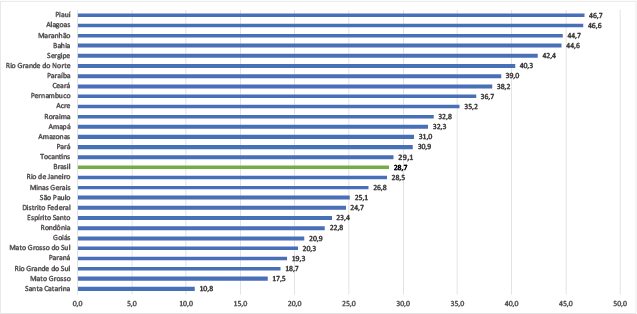 A taxa média anual de subutilização para o Brasil ficou em 28,1%. Entre as Unidades da Federação, as maiores taxas ficaram com Piauí (46,4%), Alagoas (45,1%) e Maranhão (44,9%) e as menores com Santa Catarina (11,8%), Mato Grosso (17,7%), Paraná (18,9%) e Rio Grande do Sul (19,0%), as únicas abaixo de 20,0%.