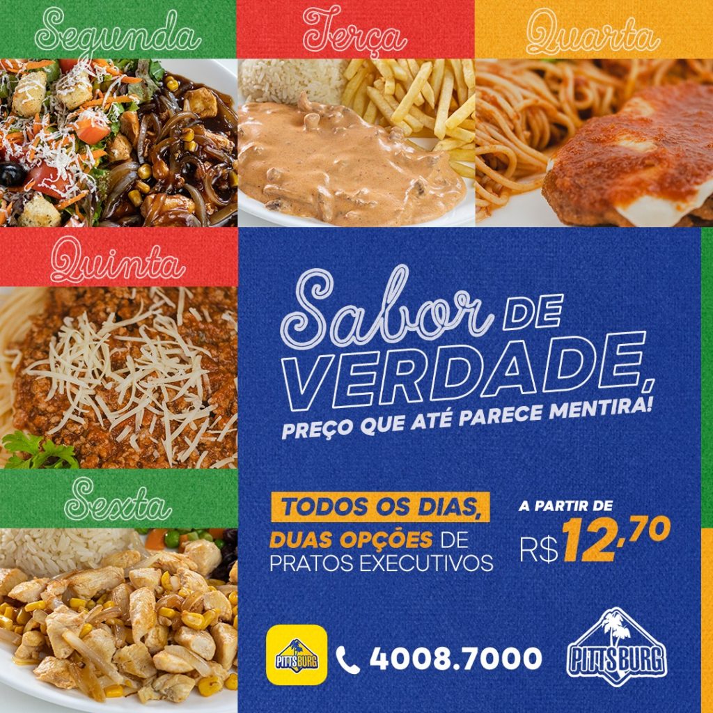 O Pittsburg acaba de lançar a promoção Prato do Dia, com sugestões diárias de pratos executivos a preços promocionais que podem ser encontrados nas lojas da rede em Natal e Mossoró, e no delivery pelo (84) 4008-7000, aplicativo do Pittsburg, iFood ou Rappi. Os pratos têm desconto de 20% e custam a partir de R$ 12,20. As ofertas são válidas de segunda a sexta-feira.