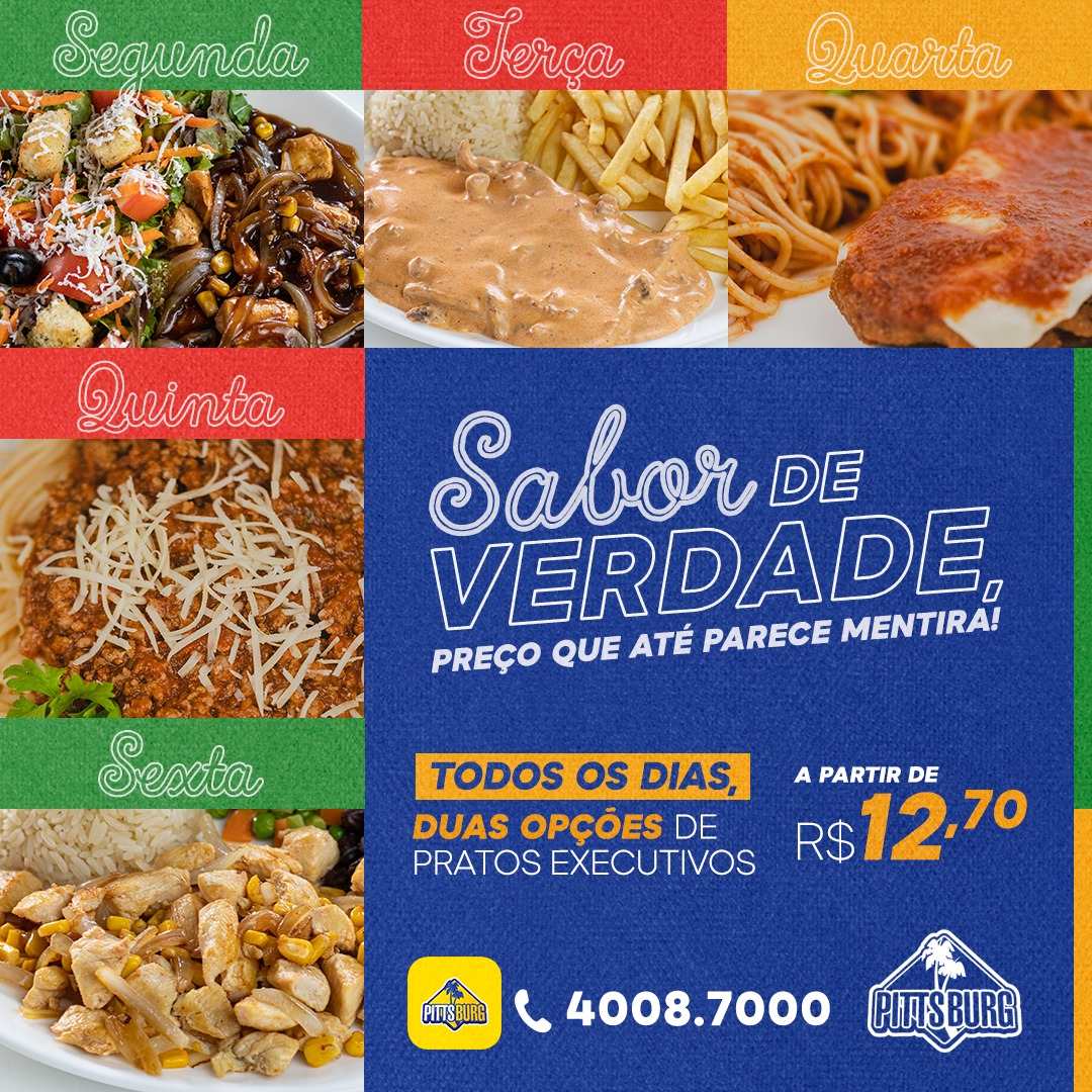 Os pratos executivos do Pittsburg para o almoço tem opções variadas para todos os gostos e, dependendo do prato, o cliente pode escolher três acompanhamentos de sua preferência ou montar o seu próprio prato. A hora do almoço nunca foi tão saborosa e em conta. Quem já conhece, sabe. Os pratos são super bem servidos e deliciosos.