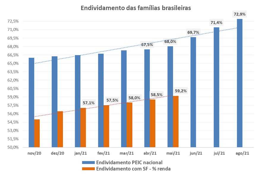 A Pesquisa de Endividamento e Inadimplência do Consumidor (Peic), da Confederação Nacional do Comércio de Bens, Serviços e Turismo (CNC), mostra resultado alinhado e a mesma tendência: 72,9% das famílias brasileiras chegaram a agosto endividadas, a maior proporção em 11 anos.