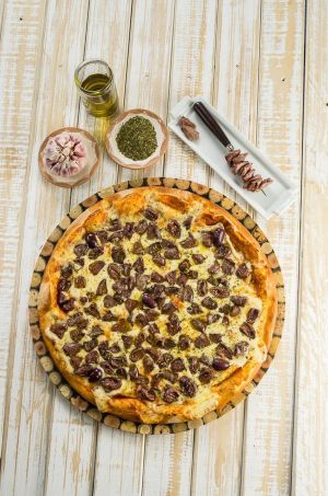 Pizza de carne seca: carne seca, cebola, pimenta biquinho e cream cheese.