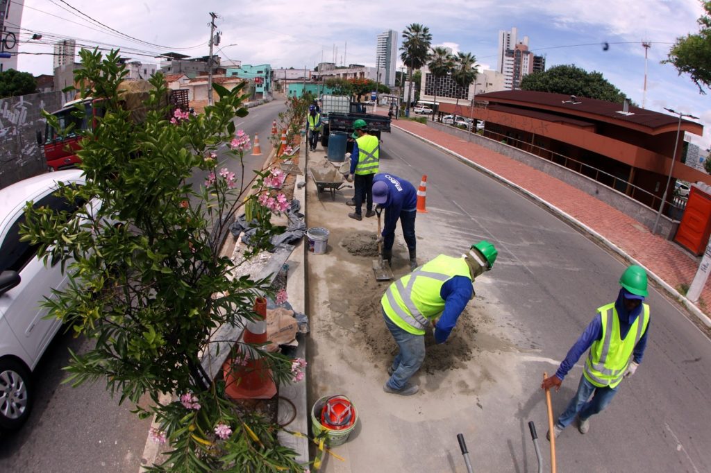 O serviço consiste no assentamento de meios-fios e de passeios públicos danificados pelas águas de chuvas ou por imprudência de motoristas. Duas equipes de trabalhadores atuam na reposição de todas as peças que estavam fora do lugar e substituição de outras que estavam quebradas.