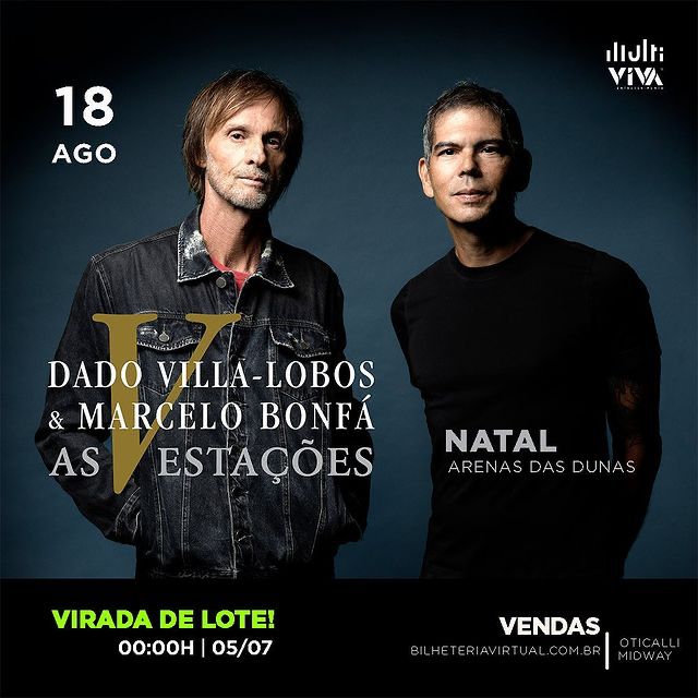 Nesta quarta-feira, dia 05 de julho, tem virada de lote dos ingressos para o show dos músicos Dado Villa-Lobos e Marcelo Bonfá em Natal. O projeto “As V Estações” vai passar pela capital potiguar no dia 19 de agosto e os ingressos estão à venda na Oticalli do Midway e bilheteriavirtual.com.br.