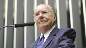 Ex-presidente José Sarney discursando na tribuna da Câmara dos Deputados durante sessão em homenagem ao Ulysses Guimarães.