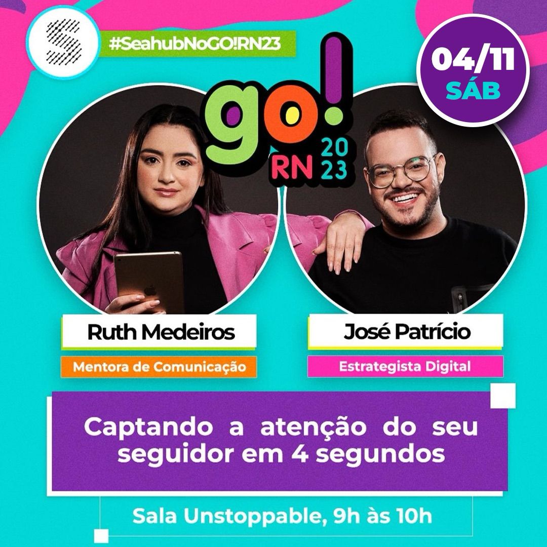 No segundo dia de evento, 04/11, José Patrício e Ruth Medeiros estarão no Palco da Sala Unstoppable, promovido pelo Seahub Coworking, com o tema: Captando a atenção do seu seguidor em 4 segundos.