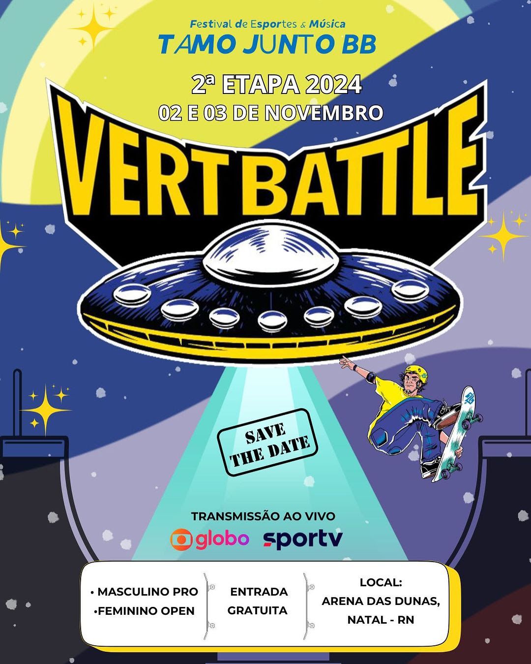 Nos dias 02 e 03 de novembro, a Arena das Dunas, em Natal (RN), receberá a última etapa do circuito brasileiro de skate vertical, o Vert Battle, maior campeonato da modalidade no Brasil, com transmissão ao vivo pelos canais Globo e SporTV.