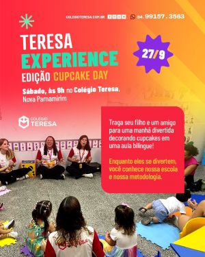 O Colégio Teresa promove no sábado, 27 de setembro, às 9h, mais uma edição do Teresa Experience, desta vez em um formato especial que une aprendizado, criatividade e sabor. Pela primeira vez, o evento contará com o Cupcake Day, uma manhã em que os alunos poderão convidar amigos para participar de uma aula bilíngue de decoração de cupcakes, enquanto os pais conhecem a escola e sua proposta pedagógica.