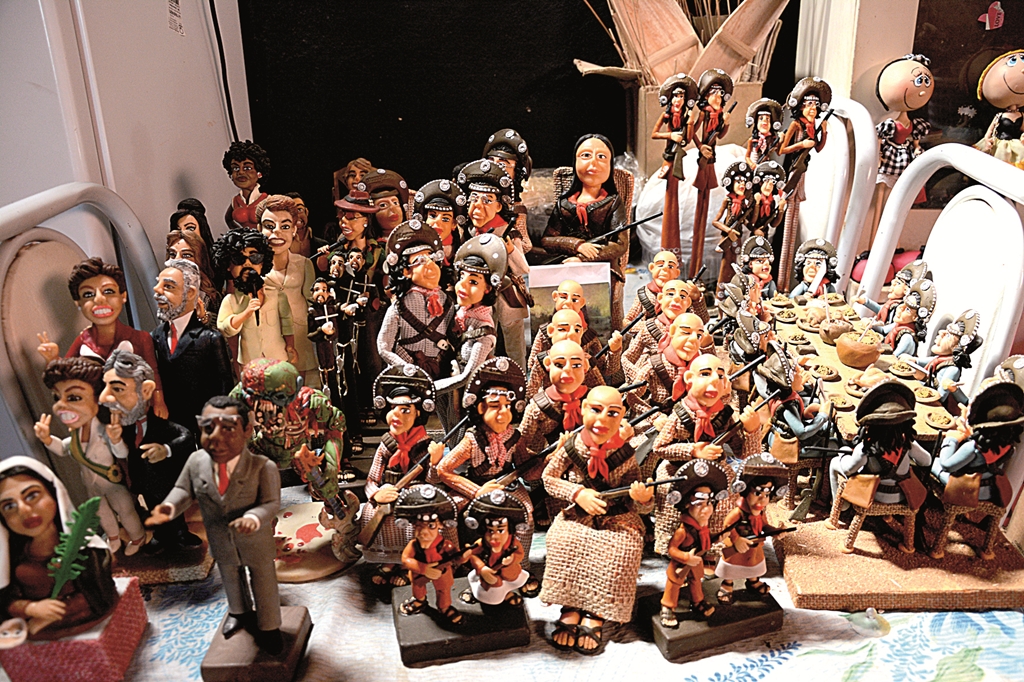 Trabalhando com o biscuit há 17 anos, o carro-chefe nas produções da família de dona Francisca é o cangaço, e praticamente todas as peças produzidas levam o tema. Seus produtos também são famosos pela riqueza de detalhes, o que lhe rende muitos pedidos de peças personalizadas para festas de casamento e aniversário. Dona Francisca também produz caricaturas de famosos e, inclusive, já entregou pessoalmente ao ex-presidente Lula uma imagem sua. “Também já entreguei uma da Dilma a ela. Já participei de vários programas de televisão porque consigo reproduzir qualquer imagem com muita riqueza e identidade. Minha técnica eu desenvolvi sozinha e meus filhos estão no mesmo caminho. Hoje eles estão trabalhando até melhor que eu”, destaca.