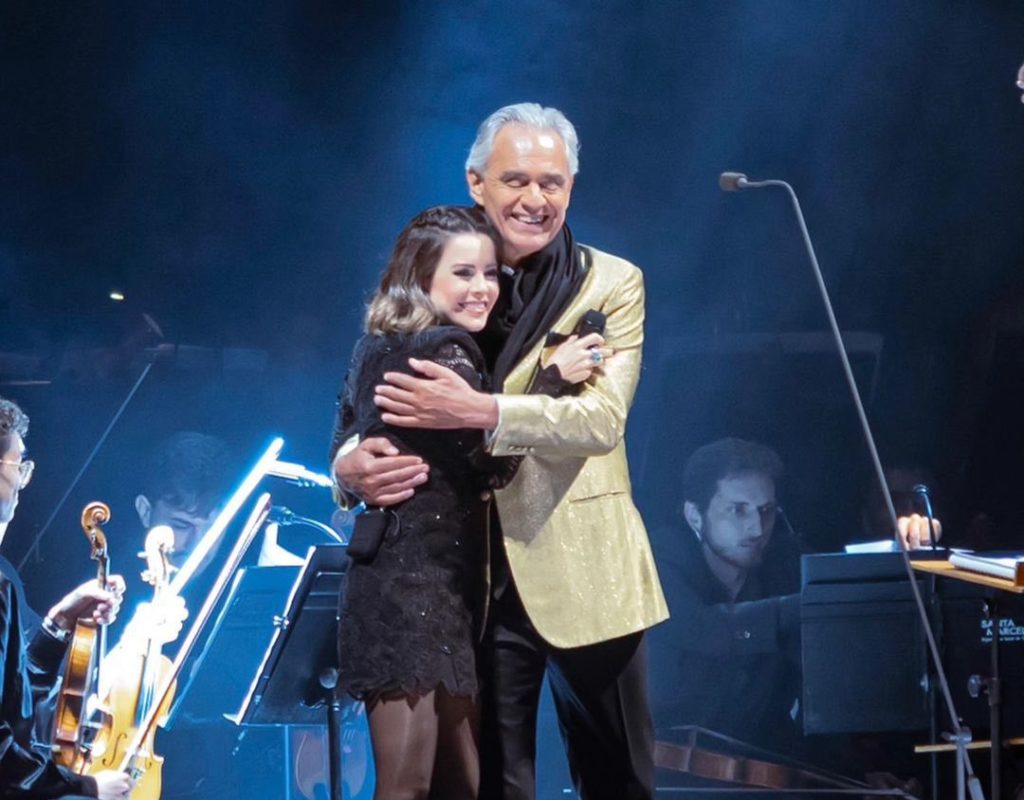 Na noite do sábado, 25, a cantora e compositora Sandy fez uma participação especial no show de 30 anos de carreira do cantor italiano, Andrea Bocelli, que aconteceu em São Paulo. Para o espetáculo, Sandy optou por um visual all black, composto por um vestido de renda da Martha Medeiros.