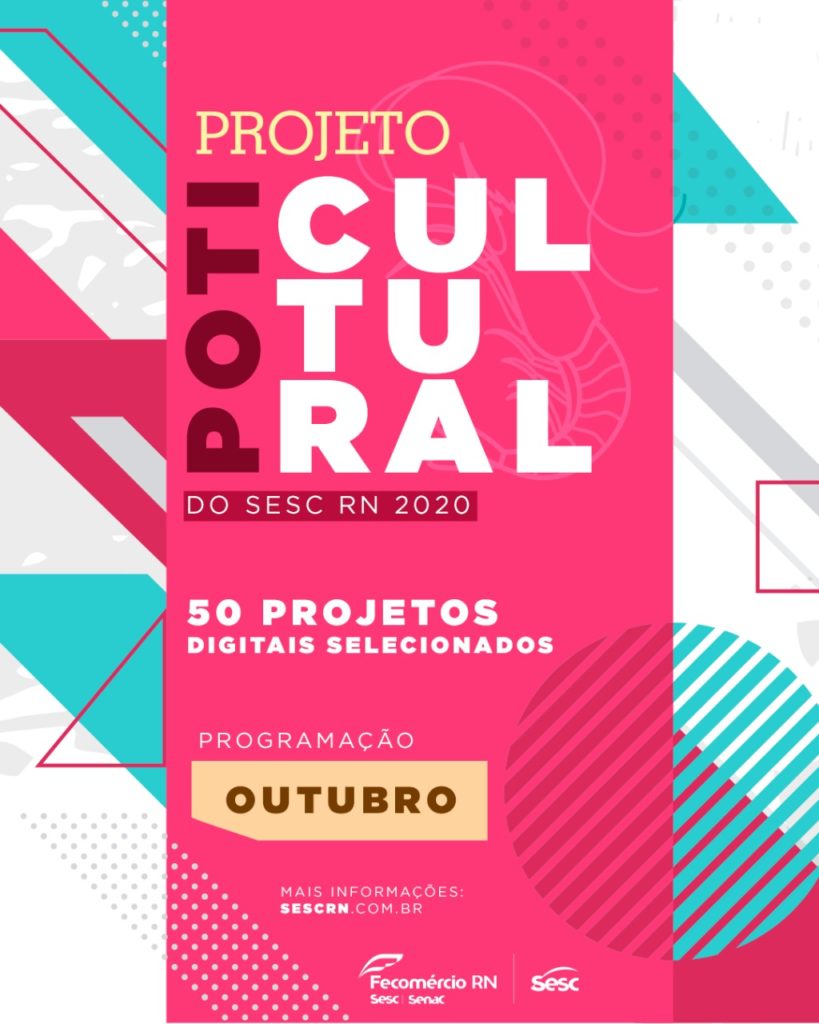 Um dos maiores editais de fomento à cultura do Rio Grande do Norte, o projeto Poti-Cultural Sesc 2020 segue com sua programação no mês de outubro, anunciando dezessete atrações audiovisuais que serão disponibilizadas nas redes sociais do Serviço Social do Comércio (Sesc RN), entidade do Sistema Fecomércio RN. A ideia surgiu como forma de amenizar os efeitos da pandemia junto à classe artística potiguar, pois prevê o pagamento de mil reais para cada um dos 50 trabalhos selecionados entre os 229 inscritos.